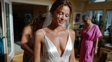 A radiant bride is carefully dressed by her friends, capturing her excitement and the heartfelt moments shared as she prepares for the wedding day in a bright room.