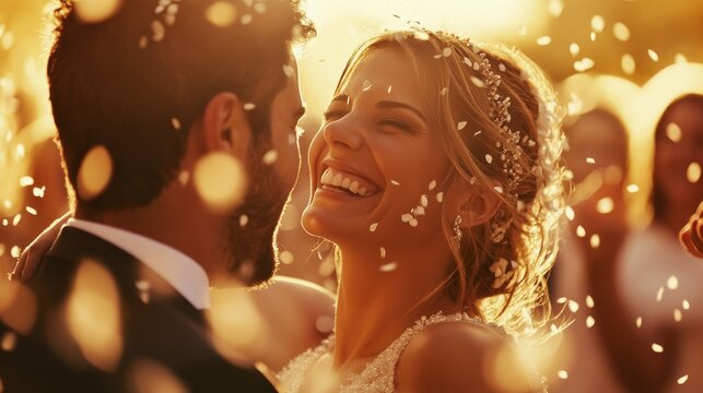 A joyous moment captured at a radiant wedding ceremony, showcasing the bride and groom embracing their special day in an ornate church setting