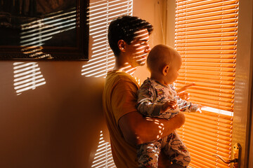 Father and baby in pajamas by the morning window light.