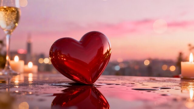 A romantic ambiance with a radiant red heart, champagne, and glowing candles at sunset