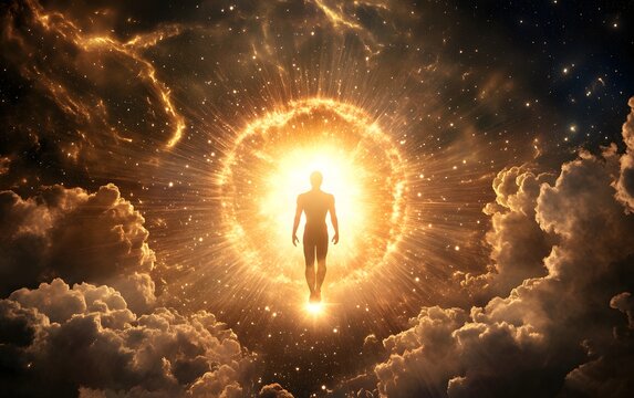 A celestial being descending from the heavens, their radiant presence filling the space with divine light