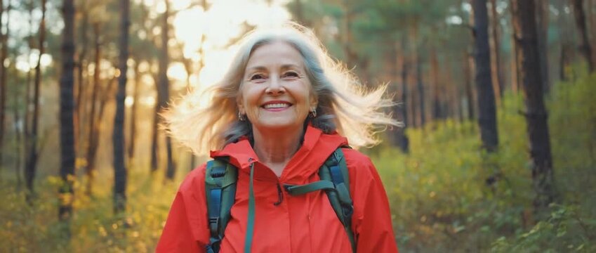 Smiling Senior on Trail: An elderly woman radiates joy as she walks through a sun-dappled forest, her spirit shining with vitality, embracing the serenity of nature.