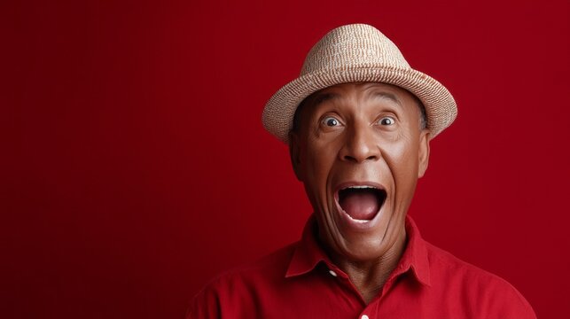 A cheerful elderly man wearing a straw hat shows a wide grin against a striking red background, capturing the essence of joy and celebration. His enthusiasm radiates warmth and happiness