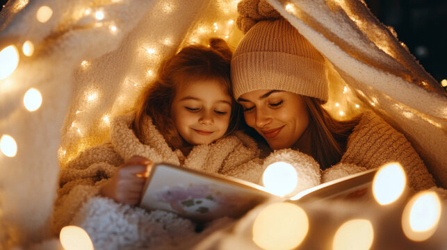 Cozy moments shared between mother and daughter as they read book together under blanket of warm lights. scene radiates warmth and love, perfect for family bonding