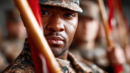 A focused soldier stands tall in uniform during a parade, radiating pride and discipline, embodying the essence of honor and duty.