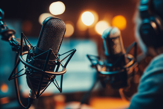 Podcast studio interior. Microphone close-up