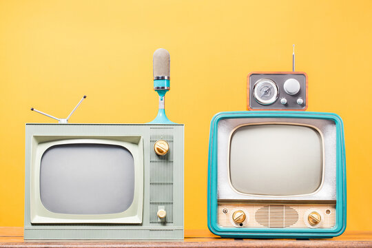 An old television set, a gold and silver microphone on a wooden table with a yellow background. The photo has a retro style filter.