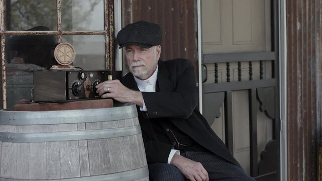 Woman is listening to radio using vintage fm receiver and enjoying analog sound of music. Hipster girl put head on table and looks with smile at retro radio device for playing compositions