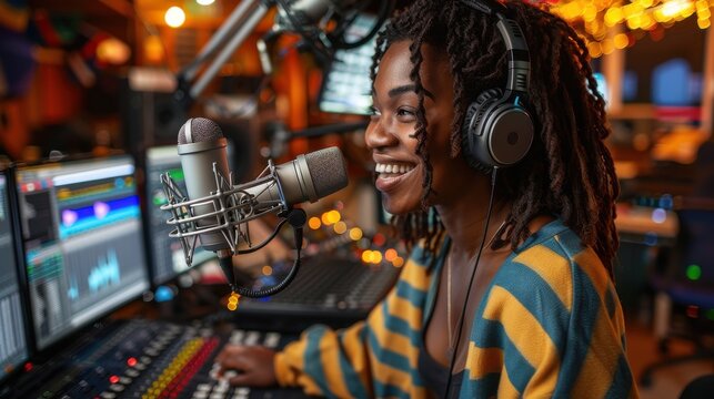 A happy radio hostess with headphones on reads the news into a studio microphone while a polished background setup plays.