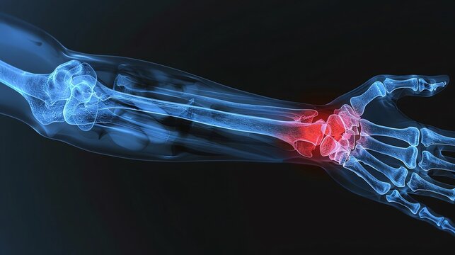 Radius Fracture Image revealing a fracture in the radius bone, near the distal end The fractured segment is marked in red, indicating the break