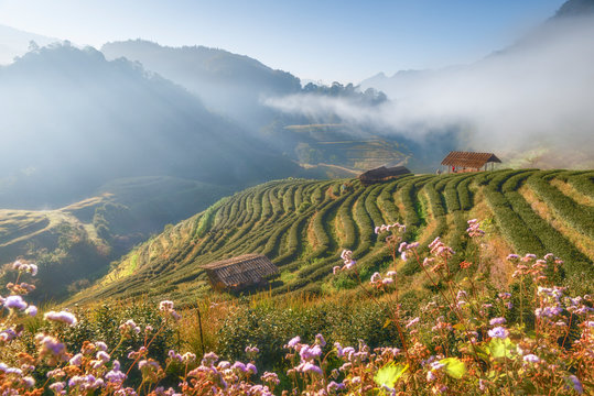 Scenic View of Tea Plantation Terrace with Morning Mist at Doi Angkhang Mountain in Winter, Fang District, Chiangmai, Thailand