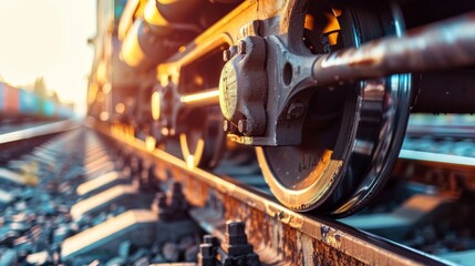Detailed view of railcar coupling on a track during golden hour