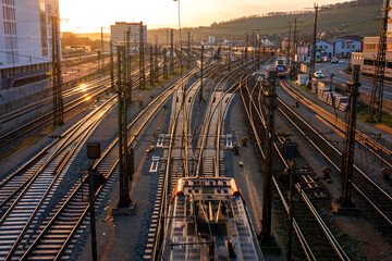 High speed passenger train in motion on railroad at sunset. Blurred commuter train. Railway station against sunny sky. Railroad travel, railway tourism. Rural industrial landscape. Concept