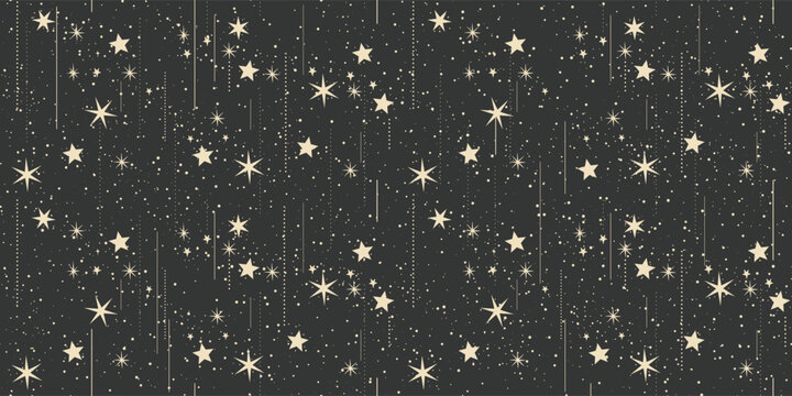 Star rain, Seamless pattern with stars and glowing dots on dark background. Repeating texture of night sky. Space and astronomy concept. Vector illustration.