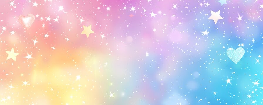 Holographic rainbow pastel kawaii unicorn background with hearts and stars, glittery and sparkly