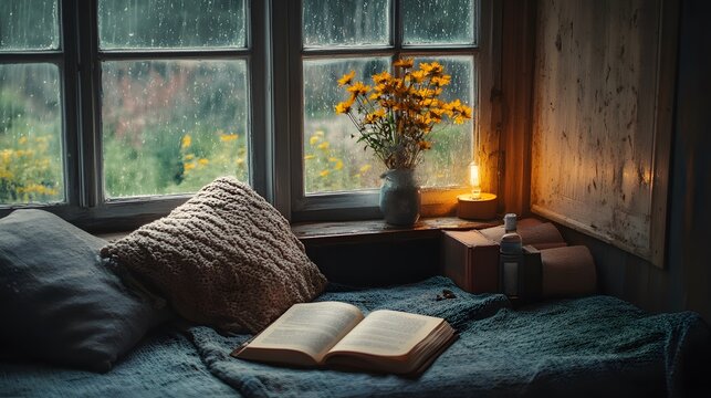 Warm cozy nook by window rustic vintage style soft light on rainy day