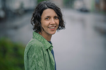 A curious child in a yellow raincoat and hat holds a multi-colored rainbow umbrella on a rainy autumn day in the forest.