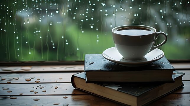 A cup of black coffee beside stack of mystery novels on a rainy day