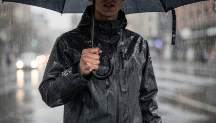 Medium shot of a person under an umbrella wearing waterrepellent treated outerwear demonstrating enhanced water resistance and fabric performance in rainy conditions.