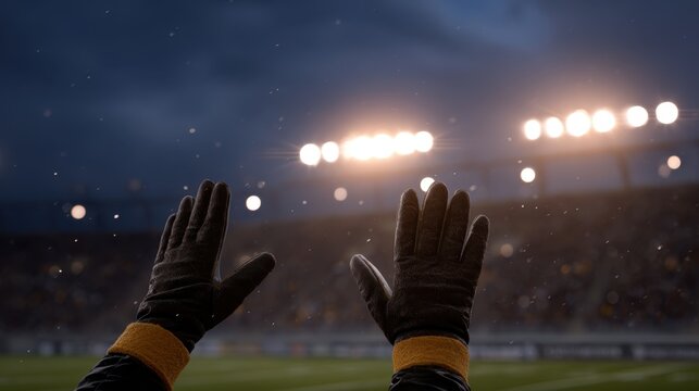 Close-Up of Gloved Hands Raised Above Crowd at Sports Event Under Dramatic Stadium Lights
