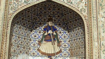 Vibrant Indian murals and intricate architecture in a historic palace corridor during daylight hours