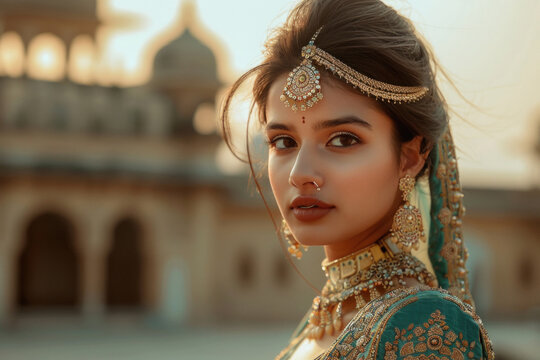 Vibrant Indian architecture, majestic Red Fort's imposing red sandstone walls and intricate white marble ornaments, set against a clear blue Delhi sky at sunset.