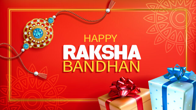 Greeting banner with rakhi (bracelet), and gifts for Raksha Bandhan (Bond of protection and care) – Indian festival of sisters and brothers. Vector illustration.