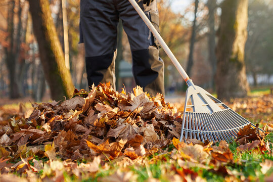 Seasonal raking of leaves in the garden. Concept of cleaning and caring for the garden. Man rakes withered and colorful leaves in the garden. Autumn cleaning before winter, spring cleaning garden.