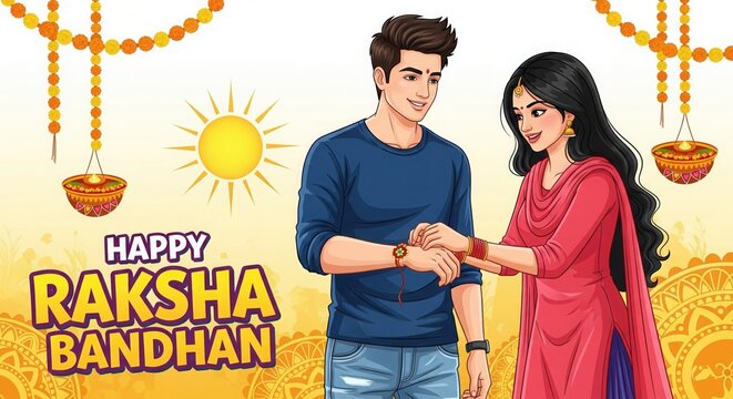 Happy Raksha Bandhan Illustration – Sister Tying Rakhi on Brother’s Hand with Bold Festive Text
