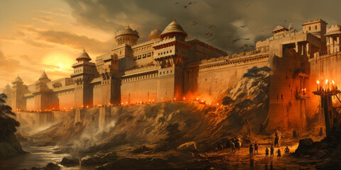 Illuminated Moroccan city rampart and Chinese citadel at night.