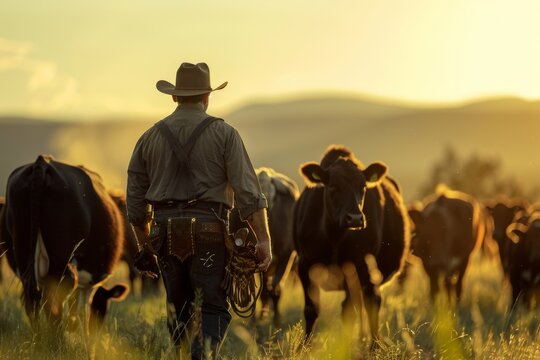 Cowboy rancher moving herd of cow calf pairs to new pasture on the beef cattle ranch