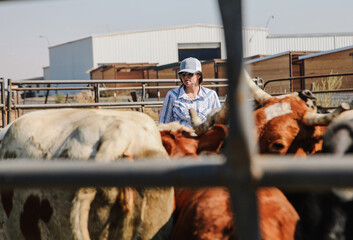 woman sorting cattle in corral