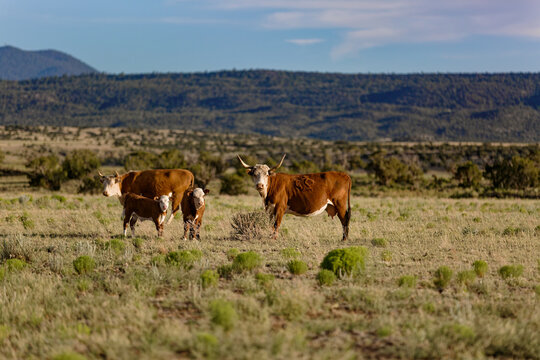 Texas Longhorn cattle with calves grazing in Arizona field