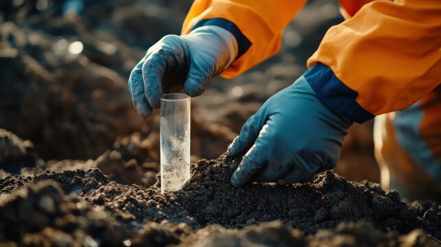 Geotechnical engineer analyzing soil samples at excavation site. Featuring scientific accuracy and assessment