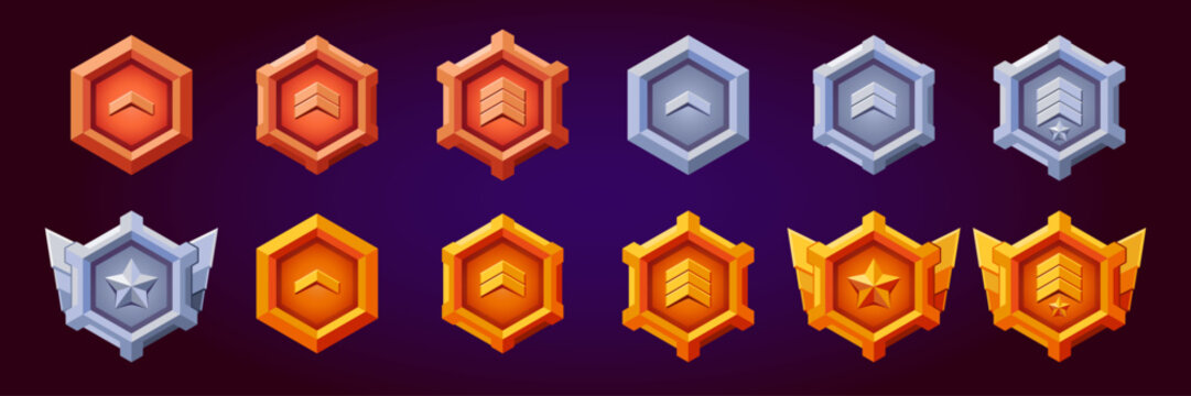 Level game rank badges set. 12 Realistic vector of silver, bronze, gold hexagon with level progress symbol. Realistic flat design. Metallic style. Progress and awards.