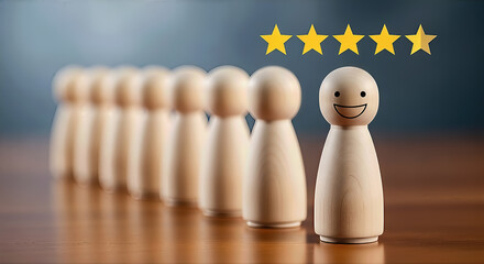 A happy wooden figure stands out from a group of similar figures, representing individuality, success, and positive feedback, with five stars above it on a wooden table