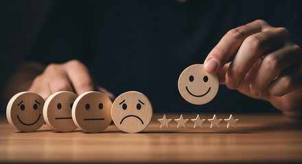 Hand selecting happy face among neutral and sad faces with five star rating system on table