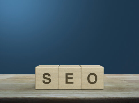 SEO letter on block cubes on wooden table over light blue gradient background, Technology search engine optimization ranking concept