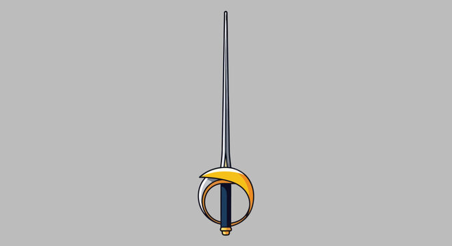 A cartoon illustration of a rapier sword with a decorative hilt, set against a gray background