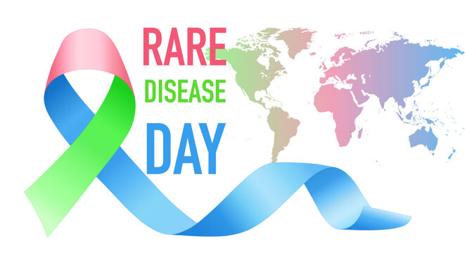 Three-color ribbon for the world rare disease day on 28 of February. On a world map background.