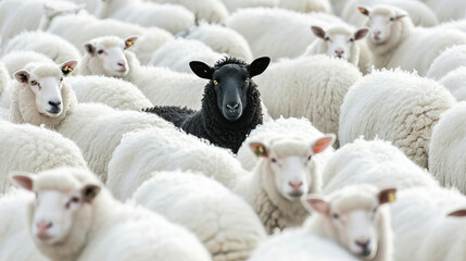 A black sheep in the midst of a white flock, exemplifying the concept of being unique – this image is AI Generative.