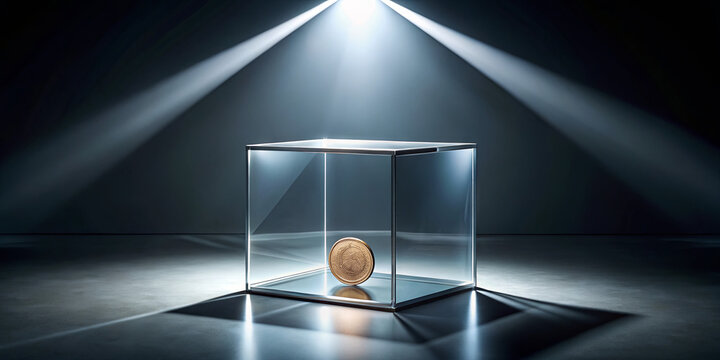 A glass display case sits in a dimly lit environment, showcasing a single coin. Soft beams of light emphasize the coin's features, creating an atmosphere of intrigue and importance