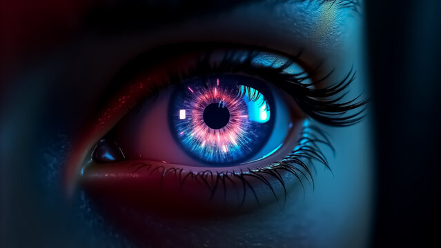 esain mata yang rumit dengan sorotan oranye menyala dan biru elektrik, membangkitkan rasa energi dan inovasi