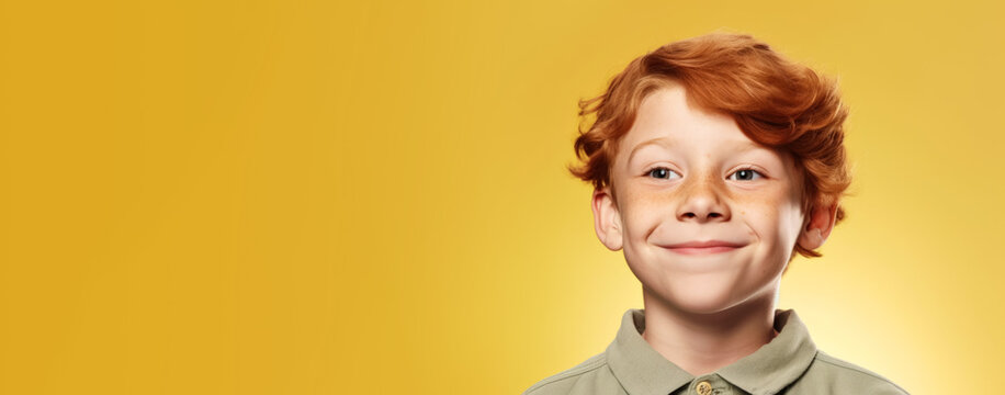 Small ginger red hair boy with freckles, smiling. He looks cute and innocent, but is probably naughty rascal. Banner with empty copyspace left side. Generative AI