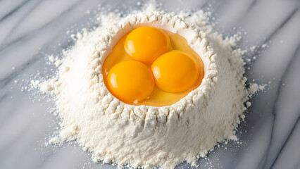 Three fresh egg yolks nestled in a mound of white flour on a marble surface ingredients for baking or pasta making