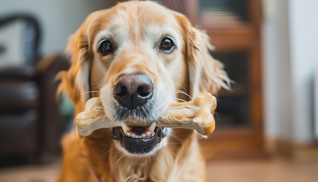 Cute Golden Retriever dog holding chew bone in mouth indoors