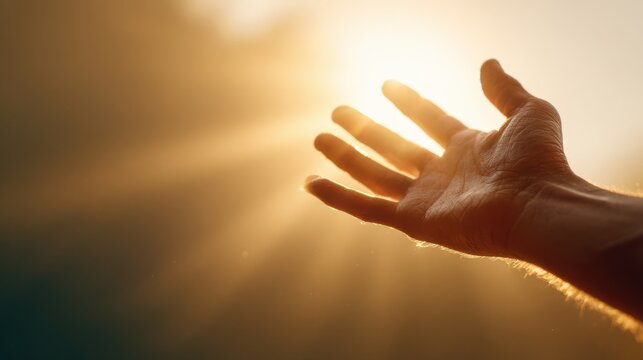 Hands reaching towards the sun, symbolizing hope, gratitude, and connection with nature in a serene, warm atmosphere.