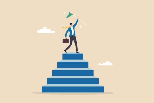 Step to success, staircase to achievement or reach winner target, progress or improvement, career success or business journey concept, successful businessman hold winning flag on top of step stair.