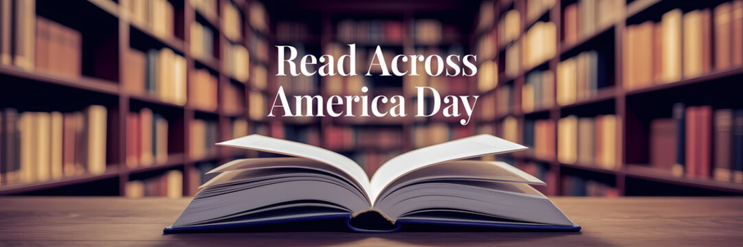 Engaging banner design for National Read Across America Day featuring a colorful book with stars and stripes, promoting literacy and community engagement.