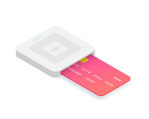 Isometric EMV chip credit card square reader. Secure cashless payment vector illustration. Wireless NFC EMV technology. Square contactless and chip reader with plastic debit card isolated on white